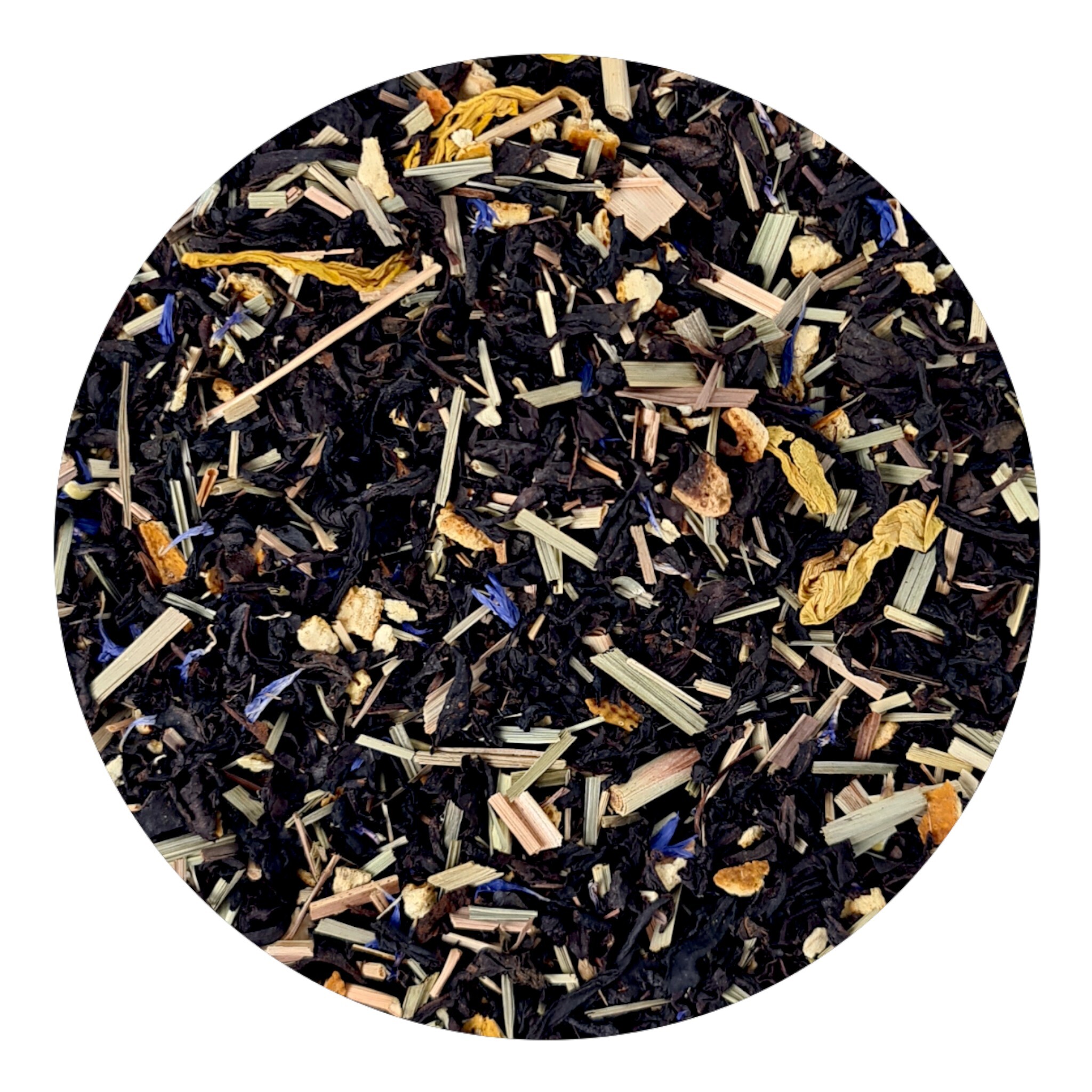 Черный индийский чай Ассам с добавлением лимонной травы, цедры апельсина, лепестков василька и подсолнечника с легким ароматом фруктов и нотками ванили.