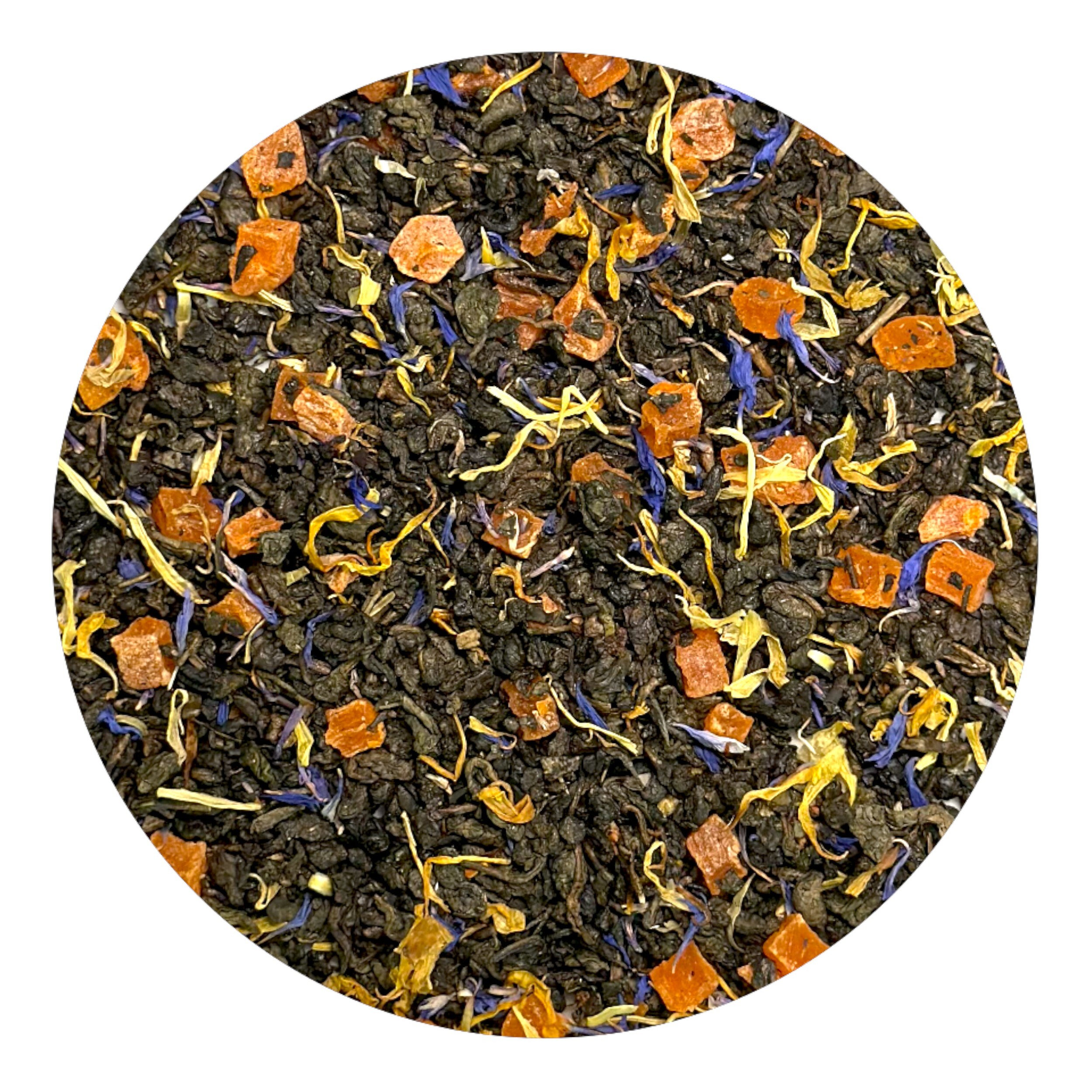 Зеленый чай Ганпаудер, кусочки клубники и тропических фруктов, лепестки календулы. Напиток имеет летний фруктово-ягодный вкус и аромат.