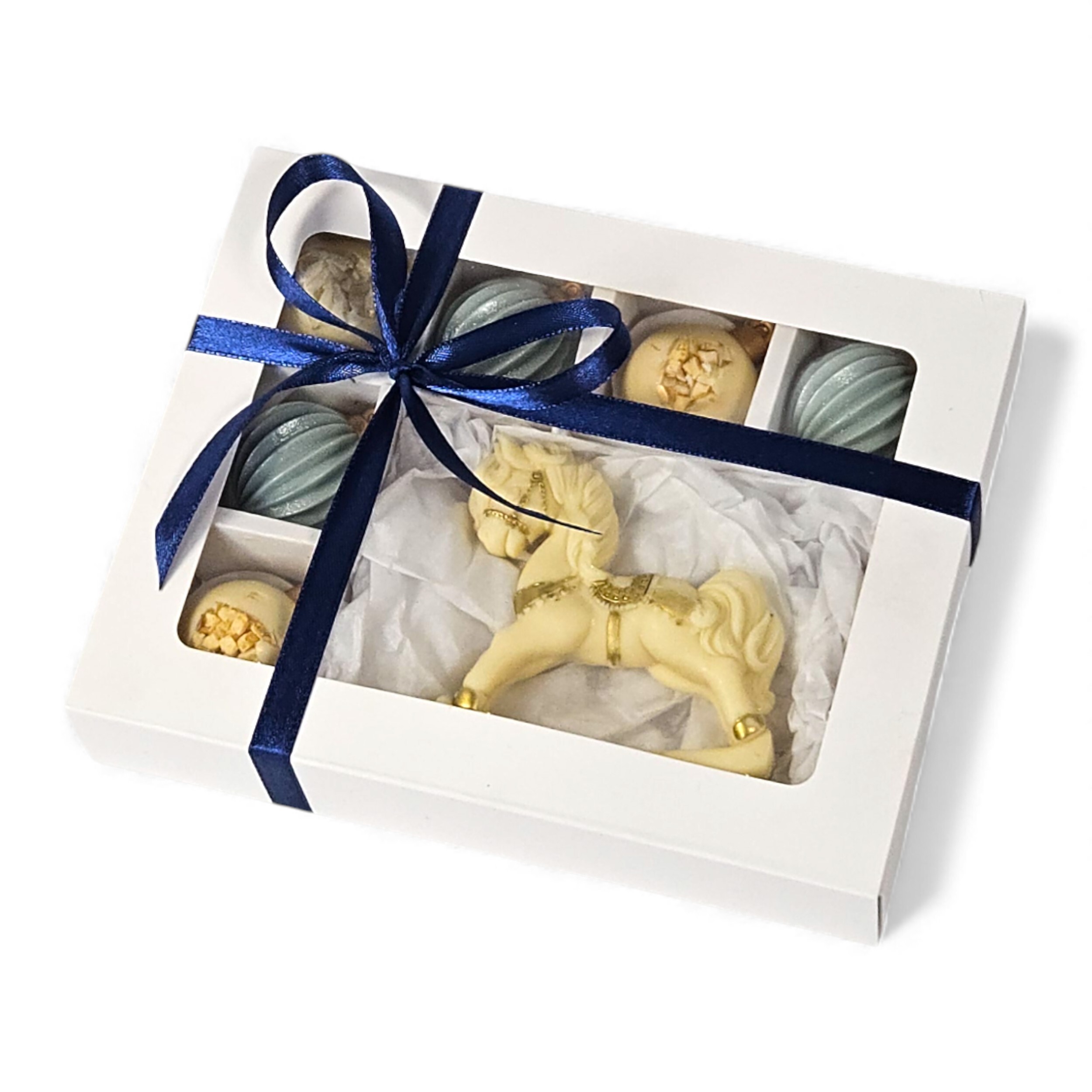 Воплощение сладкой зимней сказки. В белой коробочке — большая шоколадная фигурка "Символ года" и шесть маленьких шоколадных елочных игрушек. Этот набор станет прекрасным подарком для детей и всех сладкоежек.