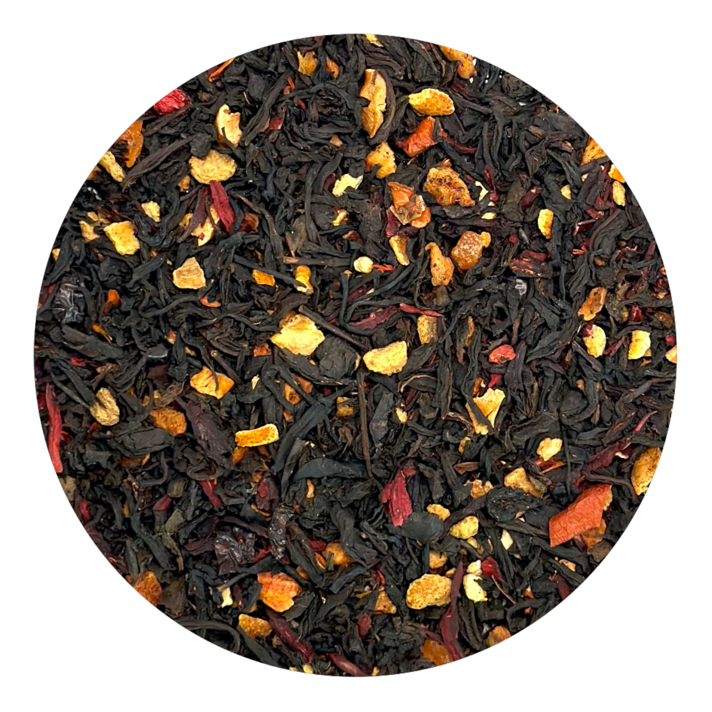 Яркий коктейль из цукатов тропических фруктов, кусочков яблока, цедры апельсина, ягод смородины и клубники, на основе смеси из черного индийского чая Ассам, цедры шиповника и рубленых лепестков гибискуса, украшенный лепестками сафлора, с ароматом ягодной карамели.
